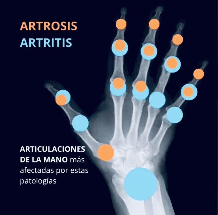 En esta foto podemos ver marcado en naranja las articulaciones que más se ven afectadas por la ARTROSIS y en azul las más afectadas por la ARTRITIS REUMÁTICA.