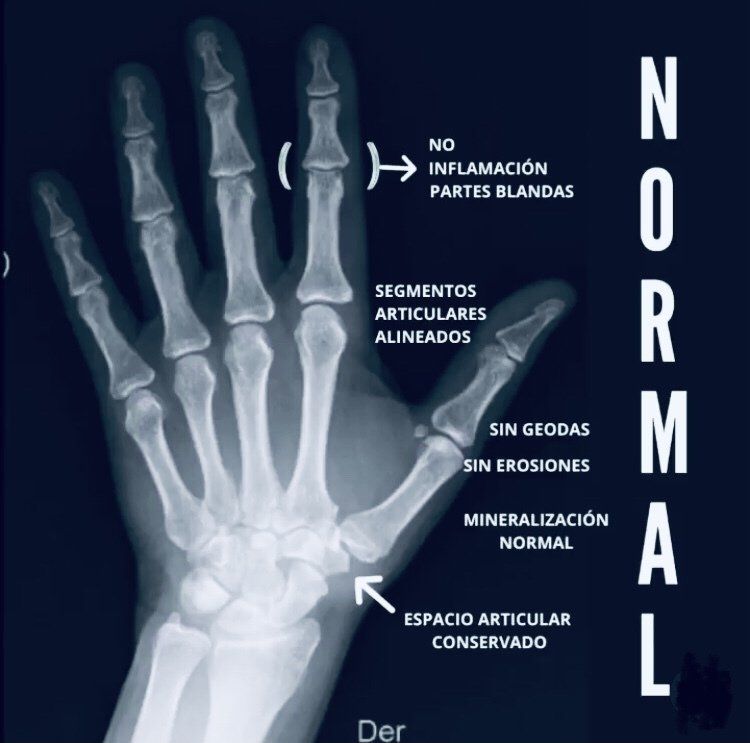 En la primera radiografía se puede ver una mano normal de adulto donde se aprecia la ausencia de inflamación, la correcta alineación de las articulaciones, una mineralización normal y los espacios interarticulares conservados.